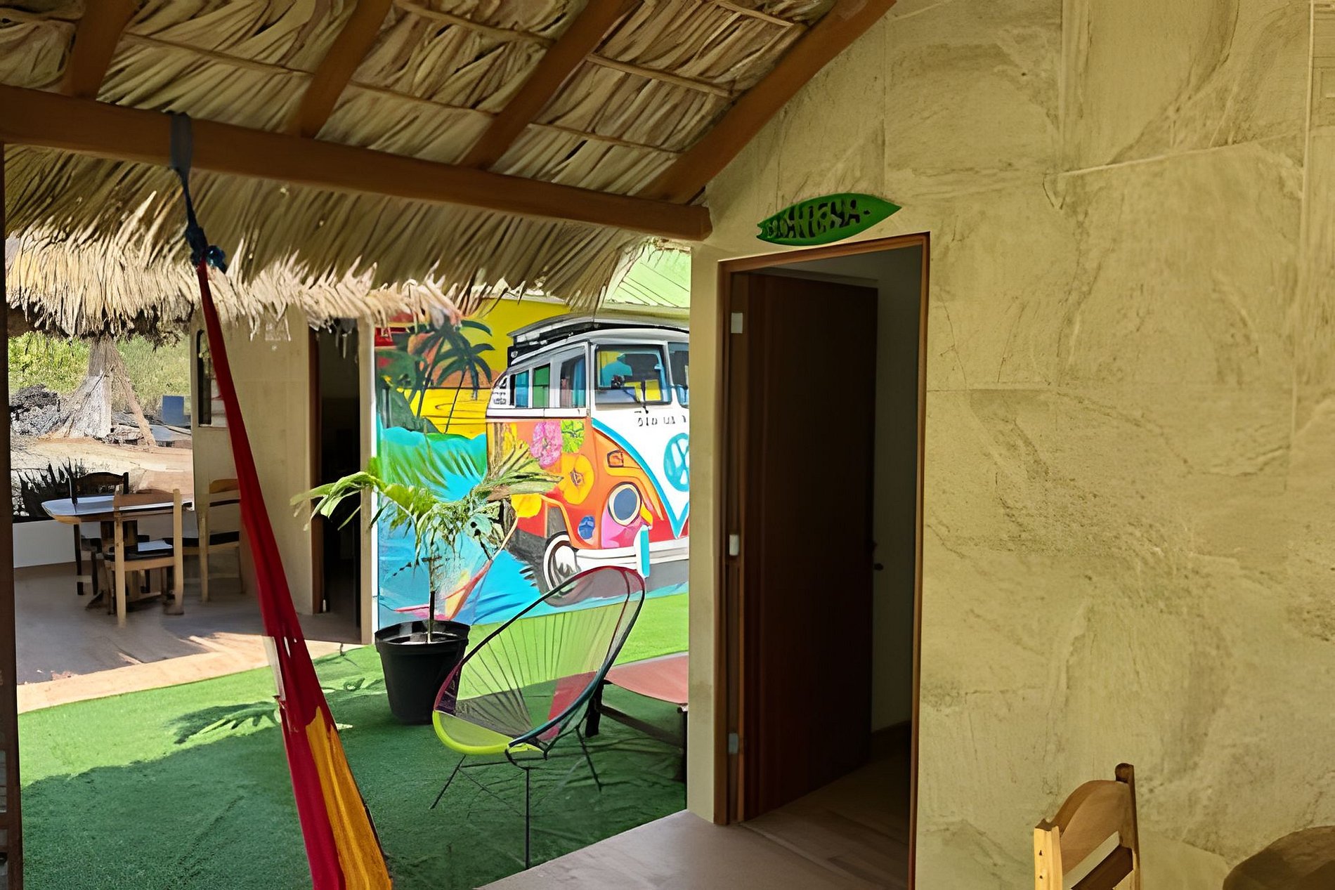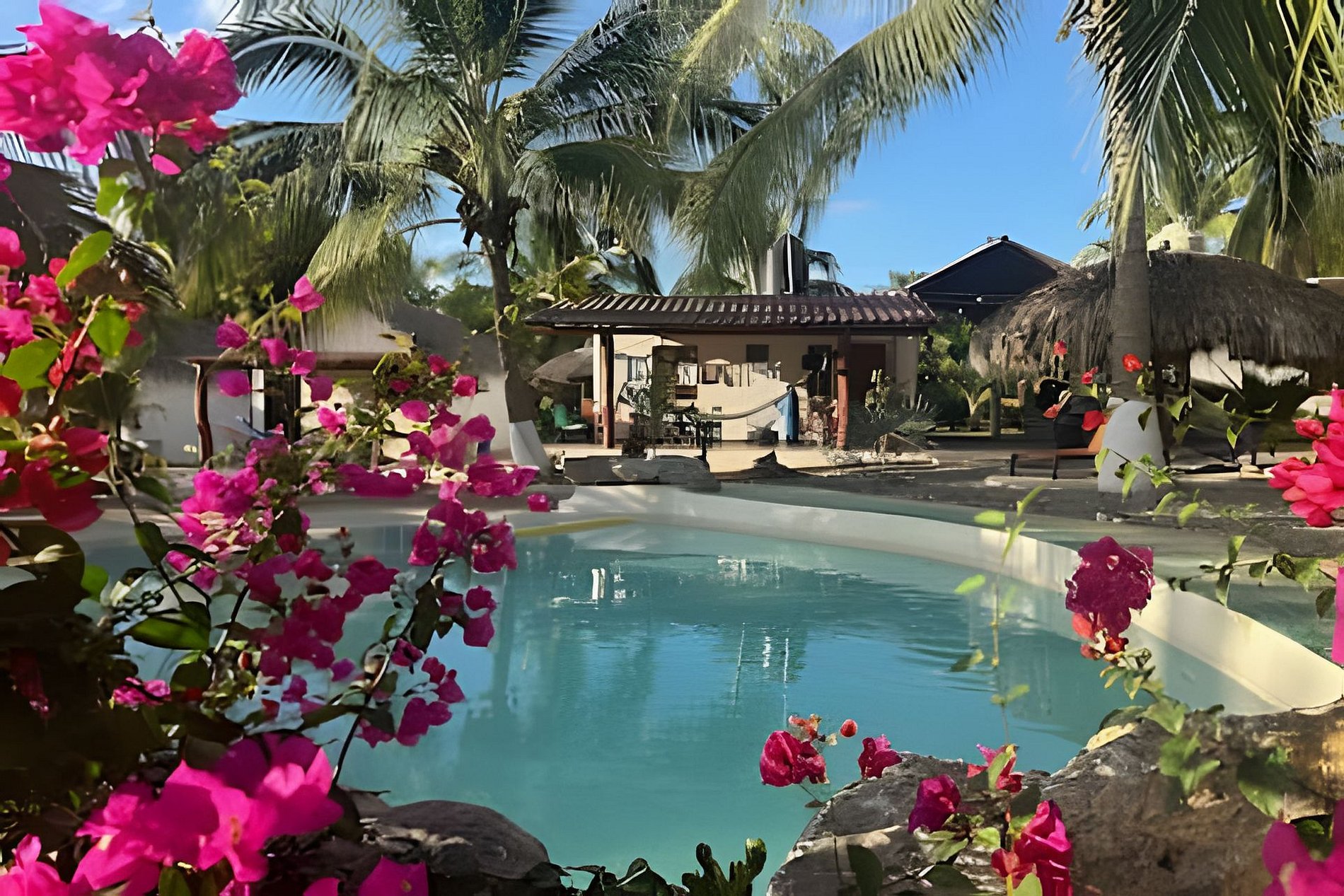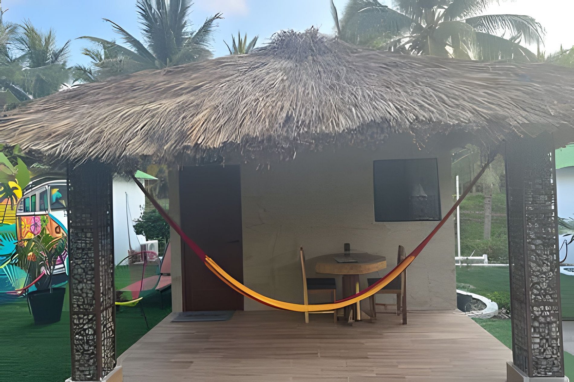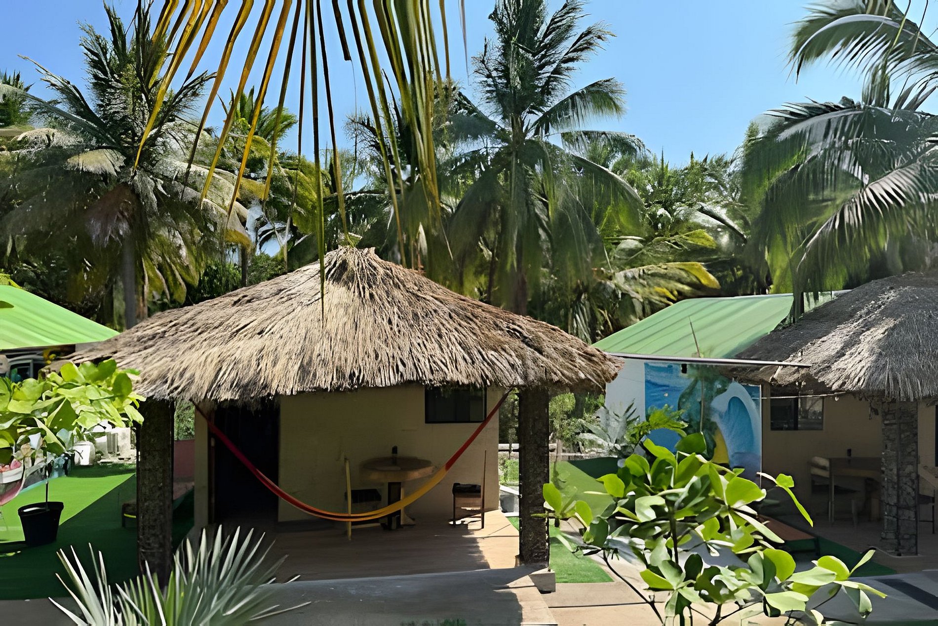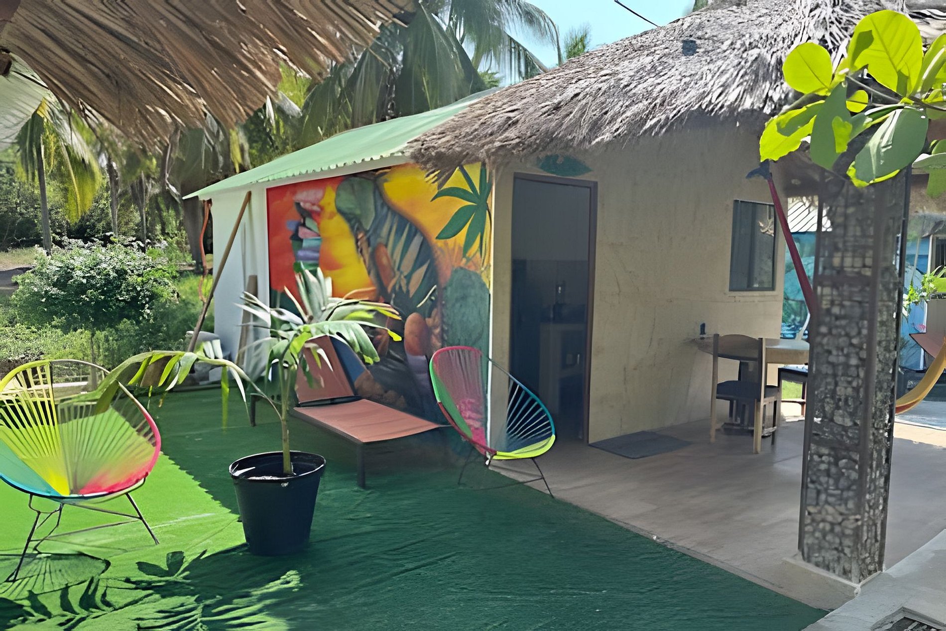 Disfruta de un día de sol con la familia respira aire fresco y renuevate en el jardín. Y qué hay mejor que compartir rico desayuno en la mesa de la terraza con vistas a la naturaleza. El exterior de nuestro alojamiento es un espacio para que los niños disfruten en una alberca tipo natural, hay algunas cabañas con mastros y sillones para relajarte. La cabaña cuenta con los necesario, aire acondicionado, baño interior y cocina equipada. Estamos a unos 5 minutos caminando de la Playa